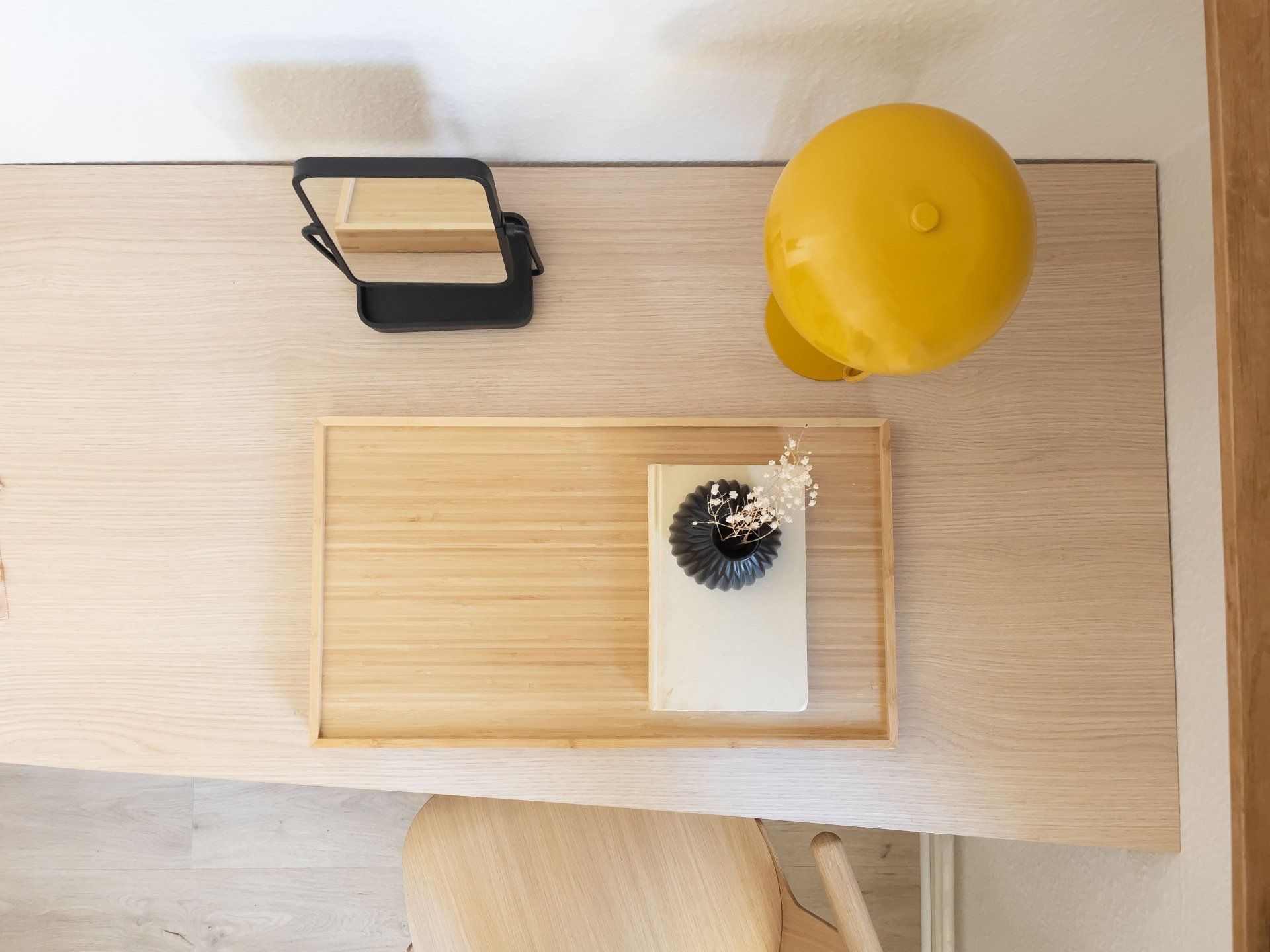 Eichenholz greift auch der zusätzliche, zweite Arbeitsplatz des Apartments auf, welcher die Nische räumlich perfekt ausnutzt. Durch weiße und beige Heimtextilien aus Leinen erhält das Zimmer eine luftige Leichtigkeit. Als Blickfang fungiert die hochwertige Pendelleuchte von