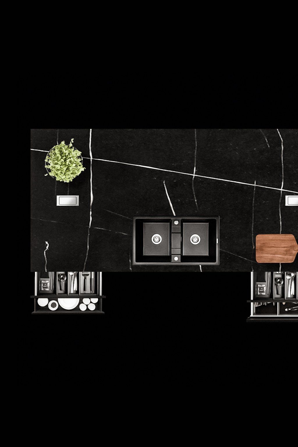 in Betonoptik sowie Arbeitsflächen sollten der starken Beanspruchung durch die intensive Nutzung im gewerblichen Bereich genügen. Die widerstandsfähigen Oberflächenstrukturen von Marquina-Marmor verwendeten wir daher als Verkleidung für Küchenarbeitsplatten sowie zur Ausstattung der Badezimmer. Die weißen, sich vom intensiv-schwarzen Hintergrund abzeichnenden Adern des Marmors schufen bei SHK Karatay stilvolle Kontraste in Verbindung mit schwarzen Schränken.