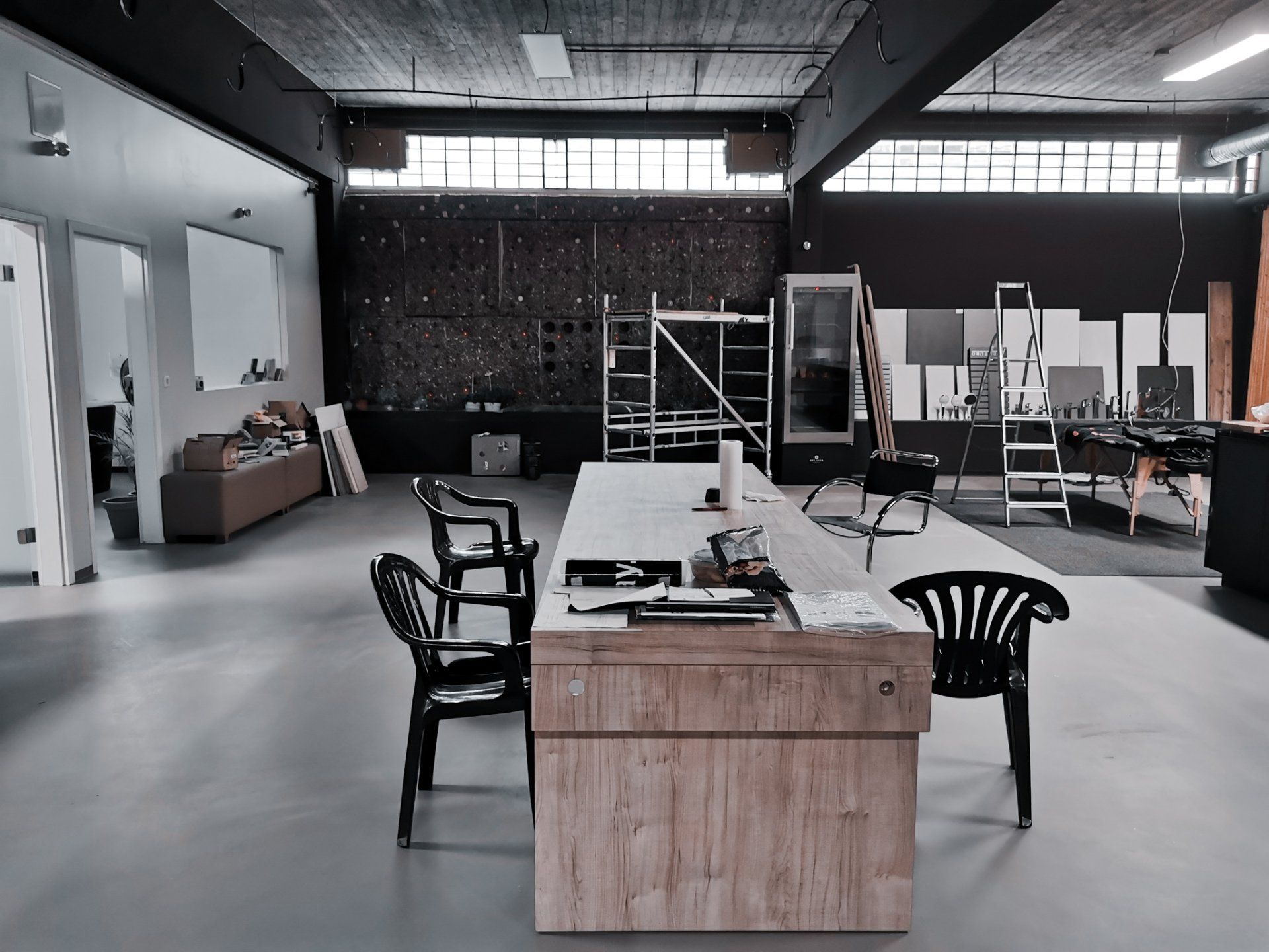 Ein befreundeter Installateur sowie Ausführungsplaner für Innenausbau wandte sich mit einem herausfordernden Anliegen an mich. Auf rund 290 Quadratmetern sollten Küchen, Bäder, Empfangsbereich, Büroflächen und mehr entstehen. Sie sollten in der ehemaligen Industriehalle schlichte Eleganz und Hochwertigkeit vereinen. Der besondere Anspruch dieses Interior Designs bestand darin, ein gehobenes und dennoch prunkfreies Konzept zu kreieren. Zudem waren die unterschiedlichen Anforderungen der diversen Nutzungsbereiche an Design und Funktionalität zu berücksichtigen, welche weite stilistische Spannweiten implizierten.